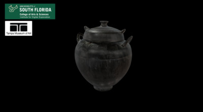 Lidded Urn: Ovoid bucchero sottile storage vessel with upturned handles, standing on a low foot. The shoulder is decorated with an intricate incised pattern of alternating full and half-open fans. The body has vertical flutes and rays above the foot. The lid has a central knob handle and two upturned perforated lug handles, with sets of incised concentric rings, the sides with rotating half-open fans. The vessel’s shape is reminiscent of the Greek stamnos, first produced in Laconia and Cyprus in the Archaic period, before being adopted in Attica, ca. 530-525 BCE. The container could store liquids, like an amphora, or mixing wine with water, like a krater. This lidded example may have been used as an urn to contain the cremated ashes of the deceased.