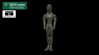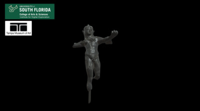 Aplu, God of Delphi: Adopted from Greece via Latium together with his twin sister Artumes (Artemis), Aplu (Apollo) retained his foreign character, especially as patron of the international oracular sanctuary at Delphi. Here he is portrayed with a short mantle draped over his left arm and waist, but otherwise nude, and crowned with a garland of laurel branches. His raised left hand would have held an attribute such as a lightning bolt. His outstretched right hand carries a small deer.