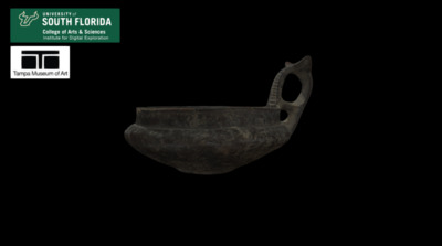 Cup with Ring Handle: Dark-brown impasto drinking cup (kyathos) with a single, horned handle, attached to the rim and looping in a ring to the shoulder. The shape, dating to the Villanovan period, was an Etruscan creation; the word kyathos, however, is Greek, and refers to a wine ladle inspired by the Etruscan cup.