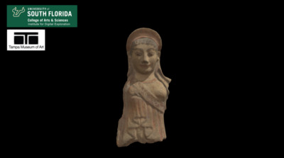 A painted, mold-made terracotta statuette in the shape of a young woman, likely serving as an architectural decoration of a temple pediment. In style derived from the Archaic Greek korē (“girl”), she wears a crown (stephanē) in her curly hair, as well as a veil falling over her shoulders, an embroidered and hemmed tunic (chitōn) and a stylized pleated overgarment (himation) with an embroidered band across her chest. Her lovely face is characterized by the archaic smile as well as thin arching brows over her large almond-shaped eyes.