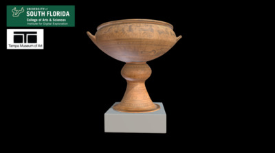 A bucchero sottile drinking cup on a high stem with flaring foot. The body is ornamented with alternating buds and petals. The exterior of the lip is incised with a zigzag band between parallel horizontal lines, the interior with two horizontal lines. The strap handle extends prominently above the rim. The top is decorated with a stylized, double-sided head of Potnia Theron (“Mistress of Animals”). An additional bar joins the handle to the rim. An applique male head marks the join of the handle with the rim of the cup. Known as kyathos, this class of cups was an originally Etruscan shape. This particular type was popular at Vulci in the Archaic period. The term kyathos, however, is derived from the Classical Greek word for a ladle to draw wine from a mixing vessel.