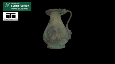 Large pear-shaped pitcher with a single handle that has a finial applique at the base in the form of a bust of a female follower of Dionysus (maenad).
