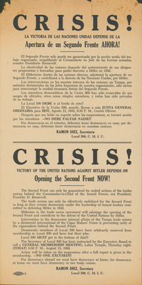 Broadside advertising a meeting of the Local 500 for a General Membership Meeting at the Labor Temple to discuss the expulsion of Democratic members and the need for union involvement in Second Front operations during World War II.