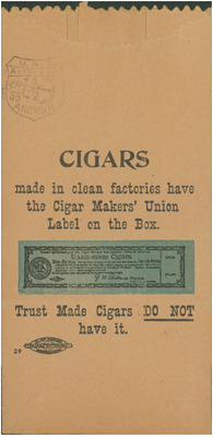 Paper bag for cigars depicting the label on union-made cigars for purchaser awareness.
