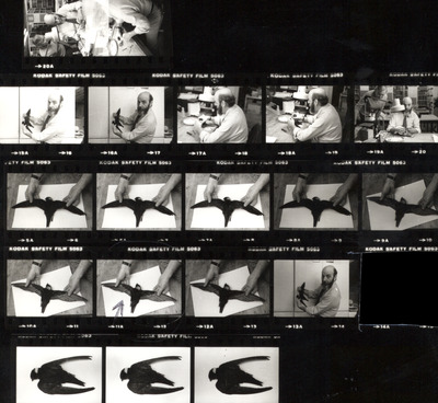 A roll of Kodak film containing 18 pictures of Tom Webber, the Florida Museum of Natural History's bird collection manager, studying the first white-collared swift (Streptoprocne zonaris) specimen found in the U.S. The bird was found deceased at a beachside home in Pensacola, Florida, on January 25, 1981.