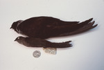 A chimney swift, or Chaetura pelagica, lies side by side with a white-collared swift with a nickel for size reference. The comparison captures how much bigger the white-collared swift is than the chimney swift. A tag in the photo says the chimney swift was found in Bethania in Forsyth County, North Carolina, on May 2, 1960.