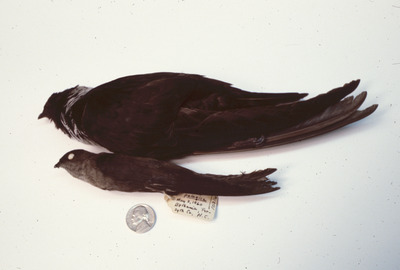 A chimney swift, or Chaetura pelagica, lies side by side with a white-collared swift with a nickel for size reference. The comparison captures how much bigger the white-collared swift is than the chimney swift. A tag in the photo says the chimney swift was found in Bethania in Forsyth County, North Carolina, on May 2, 1960.