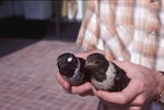 A man holds two white-collared swifts (Streptoprocne zonaris) side by side for size and feature comparison. The bird in his left hand is alive while the bird in his right is deceased.
