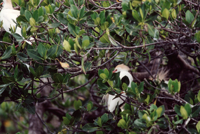 A cattle egret (Bubulcus ibis) perches on a branch hidden by foliage in Fort Pierce, Florida. The photo was taken during the spring Florida Ornithological Society meeting held April 21, 2001 at the Pelican Yacht Club.