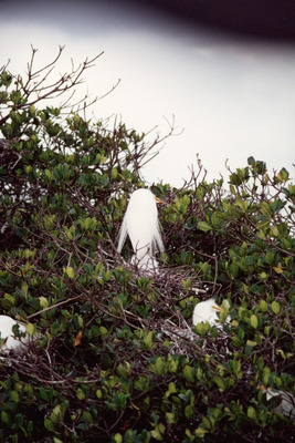 A snowy egret (Egretta thula) settles in its nest in Fort Pierce, Florida. The photo was taken during the spring Florida Ornithological Society meeting held April 21, 2001 at the Pelican Yacht Club.