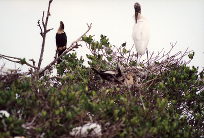 A wood stork (Mycteria americana) stands tall above its nest and that of another bird in Fort Pierce, Florida. The photo was taken during the spring Florida Ornithological Society meeting held April 21, 2001 at the Pelican Yacht Club.