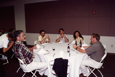 Dave Goodwin (far left) and Bill Pranty (second from left) mingle at a round table during the fall Florida Ornithological Society meeting held at Florida Gulf Coast University's Whitaker Hall in Fort Myers, Florida on October 11-13, 2001.