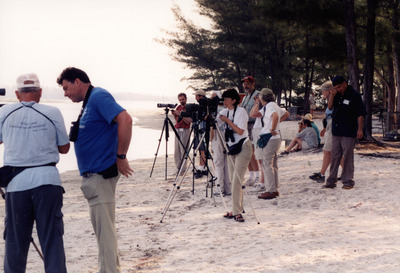 Member of a Florida Ornithological Society (FOS) birding group consult one another and observe from the shore of a beach in St. Petersburg, Florida. The trip was taken during the spring 30th anniversary FOS meeting held at Eckerd College's Fox Hall on April 26-28, 2002.