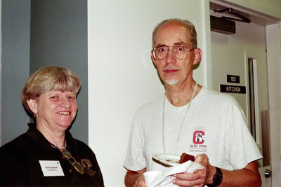 Bette Jackson (left) and Fred Lohrer (right) smile together during the fall 2003 Florida Ornithological Society meeting held at the Gibson Inn in Apalachicola, Florida on October 17-19, 2003.