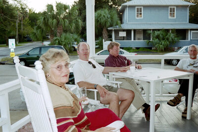 Teddy Shuler, Wilson Baker, Brooks Atherton, and others engaging in conversation on an outdoor porch. This photograph was taken during the fall 2003 Florida Ornithological Society meeting held October 17-19, 2003 in Apalachicola, Florida.