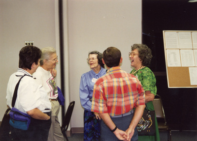 Attendees stand indoors and converse during a Florida Ornithological Society meeting held in Cocoa Beach, Florida, circa 1994.