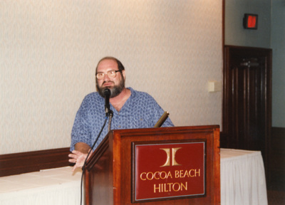 Wes Biggs stands behind a wooden podium during a Florida Ornithological Society meeting held in Cocoa Beach, Florida, at the Cocoa Beach Hilton circa 1994.