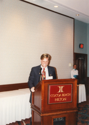 A speaker stands behind a wooden podium during a Florida Ornithological Society meeting held in Cocoa Beach, Florida, at the Cocoa Beach Hilton circa 1994.
