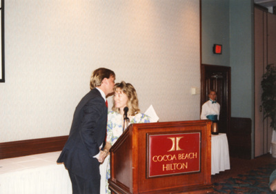 Two speakers stand behind a wooden podium during a Florida Ornithological Society meeting held in Cocoa Beach, Florida, at the Cocoa Beach Hilton circa 1994.