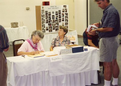 Two people are sitting behind the registration table while others walk up during a 1994 Florida Ornithological Society meeting held in Cocoa Beach, Florida.