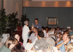A group of attendees are seated and standing around a table while Marie Slaney presents Todd Engstrom with a raffle gift in the background during a 1994 Florida Ornithological Society meeting held in Cocoa Beach, Florida.
