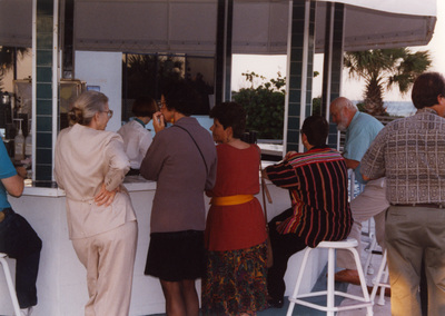 A group of attendees are seated and standing around an outdoor bar at a 1994 Florida Ornithological Society meeting held in Cocoa Beach, Florida.