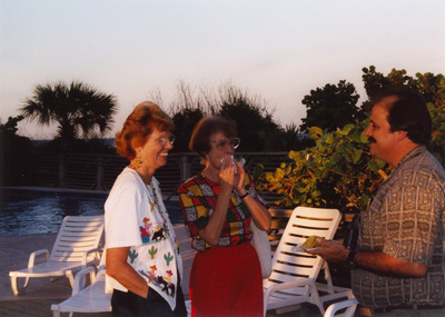 Attendees stand near and outdoor pool during a 1994 Florida Ornithological Society meeting held in Cocoa Beach, Florida.