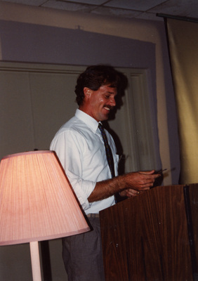 A speaker stands behind a wooden podium during a 1994 Florida Ornithological Society meeting held in Cocoa Beach, Florida.