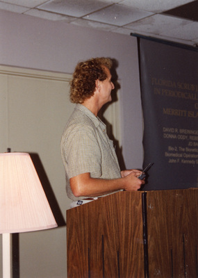 A speaker stands behind a wooden podium during a 1994 Florida Ornithological Society meeting held in Cocoa Beach, Florida.