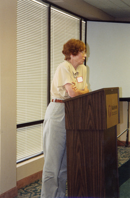 A speaker stands behind a wooden podium during the Spring 1995 meeting of the Florida Ornithological Society held April 28-30, 1995, at The Radisson Hotel in Gainesville, Florida.
