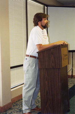 A speaker stands behind a wooden podium during the Spring 1995 meeting of the Florida Ornithological Society held April 28-30, 1995, at The Radisson Hotel in Gainesville, Florida.