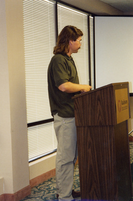 A speaker stands behind a wooden podium during the Spring 1995 meeting of the Florida Ornithological Society held April 28-30, 1995, at The Radisson Hotel in Gainesville, Florida.