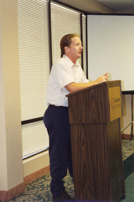 A speaker stands behind a wooden podium during the Spring 1995 meeting of the Florida Ornithological Society held April 28-30, 1995, at The Radisson Hotel in Gainesville, Florida.