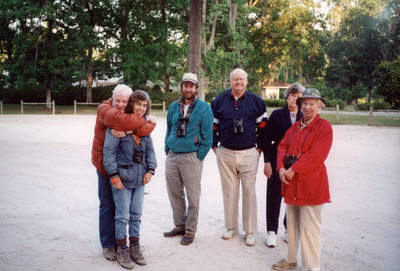 Jack P. Hailman, Elizabeth Hailman, Reed Bowman, Glen E. Woolfenden, Barbara C. Kittleson, and Phyllis Robertson (left to right) pose outdoors at the April 1997 Florida Ornithological Society Tallahassee meeting, held at Wakulla Springs.