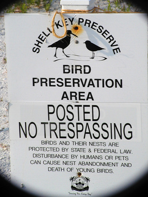 A white sign for the Shell Key Preserve Bird Preservation Area warns against trespassing and penalties for disturbing birds and nests. The photograph was taken during a field trip on April 27, 2002, during the Florida Ornithological Society’s 30th anniversary meeting.