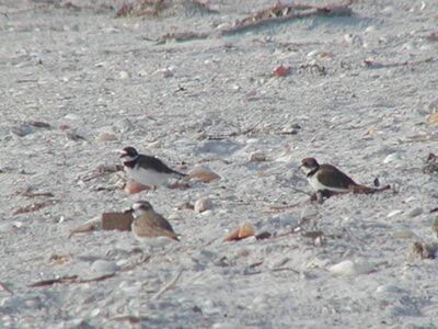 A group of birds walk along the sand of the Shell Key Preserve. The photograph was taken during a field trip on April 27, 2002, during the Florida Ornithological Society’s 30th anniversary meeting.