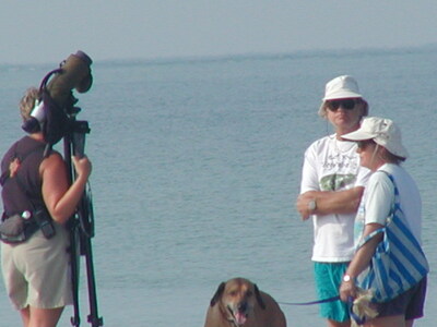 Three Florida Ornithological Society and a dog stand with photographic equipment on the shoreline of Shell Key Preserve in Tierra Verde, Pinellas County, Florida. The photograph was taken during a field trip on April 27, 2002, during the Florida Ornithological Society’s 30th anniversary meeting.