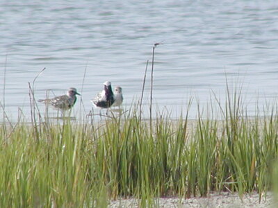 A group of Florida Ornithological Society members take photographs while wading in water near a grassy embankment at the Shell Key Preserve in Tierra Verde, Pinellas County, Florida. The photograph was taken during a field trip on April 27, 2002, during the Florida Ornithological Society’s 30th anniversary meeting.