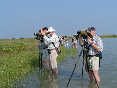 A group of Florida Ornithological Society members take photographs while wading in water near a grassy embankment at the Shell Key Preserve in Tierra Verde, Pinellas County, Florida. The photograph was taken during a field trip on April 27, 2002, during the Florida Ornithological Society’s 30th anniversary meeting.