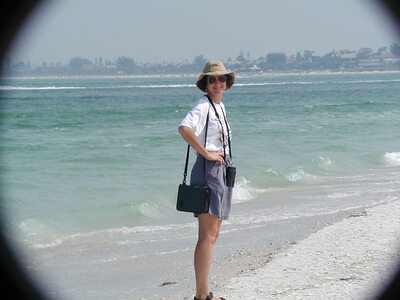 A Florida Ornithological Society member waring a hat and carrying binoculars poses on the shoreline of the Shell Key Preserve in Tierra Verde, Pinellas County, Florida. The photograph was taken during a field trip on April 27, 2002, during the Florida Ornithological Society’s 30th anniversary meeting.