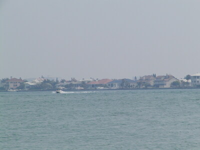 A view of water and buildings on the horizon during a boat ride to Shell Key Preserve in Tierra Verde, Pinellas County, Florida. The photograph was taken during a field trip on April 27, 2002, during the Florida Ornithological Society’s 30th anniversary meeting.