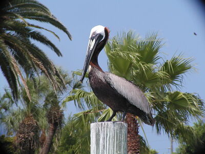 A pelican perched on a wooden post, with palm trees in the background, at Shell Key Preserve in Tierra Verde, Pinellas County, Florida. The photograph was taken during a field trip on April 27, 2002, during the Florida Ornithological Society’s 30th anniversary meeting.