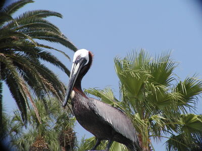 A pelican perched on a wooden post, with palm trees in the background, at Shell Key Preserve in Tierra Verde, Pinellas County, Florida. The photograph was taken during a field trip on April 27, 2002, during the Florida Ornithological Society’s 30th anniversary meeting.
