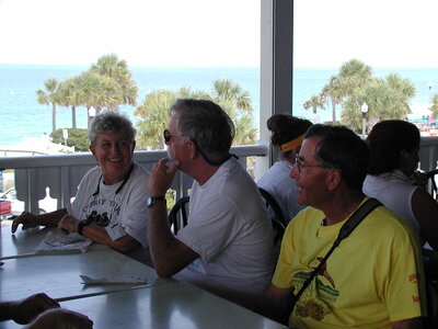 A group of Florida Ornithological Society members are seated at a window table at The Hurricane, a restaurant in St. Petersburg, Florida. Water and palm trees are visible outside. The photograph was taken on April 27, 2002, during the Florida Ornithological Society’s 30th anniversary meeting.