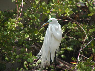 A Great egret perched among mangroves. The photograph was taken during an afternoon program at Eckerd College in St. Petersburg, Florida on April 27, 2002, during the Florida Ornithological Society’s 30th anniversary meeting.