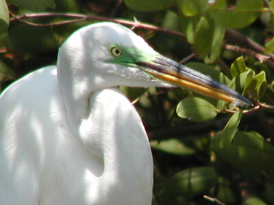 A Great egret perched among mangroves. The photograph was taken during an afternoon program at Eckerd College in St. Petersburg, Florida on April 27, 2002, during the Florida Ornithological Society’s 30th anniversary meeting.