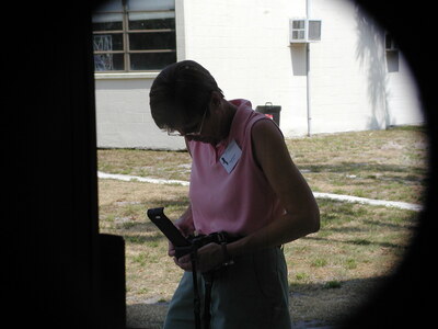 Pam Bowen stands outdoors and changes the film in a camera during an afternoon program at Eckerd College in St. Petersburg, Florida on April 27, 2002, during the Florida Ornithological Society’s 30th anniversary meeting.