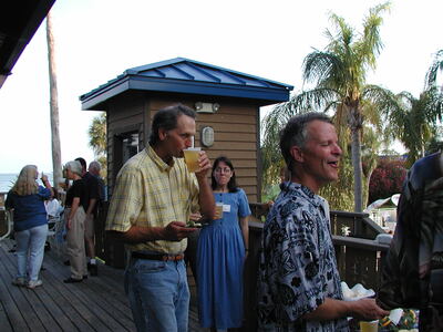 Jim Cox (far left, yellow shirt), Todd Engstrom second from right, blue shirt), and other Ornithological Society members converse and dine outdoors at a happy hour at the Holiday Inn SunSpree Resort in St. Petersburg, Florida, on April 27, 2002, during the Florida Ornithological Society’s 30th anniversary meeting.