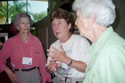 Mary Davidson (left) and Peggy Powell (right) stand indoors and converse with another person during the Spring 2004 Florida Ornithological Society meeting. The meeting was held between April 23-25, 2004, in Tarpon Springs, Florida.