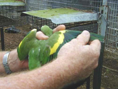 A pair of hands holds spreads the wings of a green parrot so the span is visible from behind. This photograph is one taken in accompaniment of the paper, “Distribution, population status, and documentation of exotic parrots in Broward County” by Bill Pranty and Susan Epps.